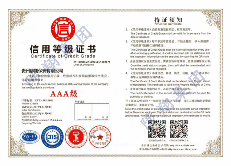 > 信用等級(jí)證書AAA級(jí)